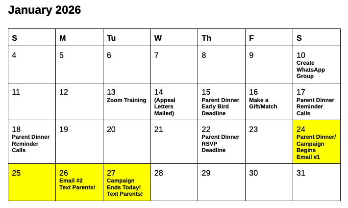 Throughout the four-day campaign, Development will send 1-2 emails each day to ALL the parents with an update and a video.